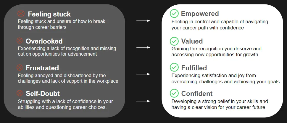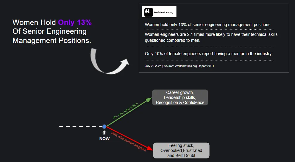 Many women engineers feel stuck in their careers, struggling to break through barriers in male-dominated fields and achieve their full potential. The Engineer to Leader program provides personalized coaching tailored to help you overcome these challenges, build your confidence, and achieve your career goals, whether it's advancing to leadership or excelling in your current role.